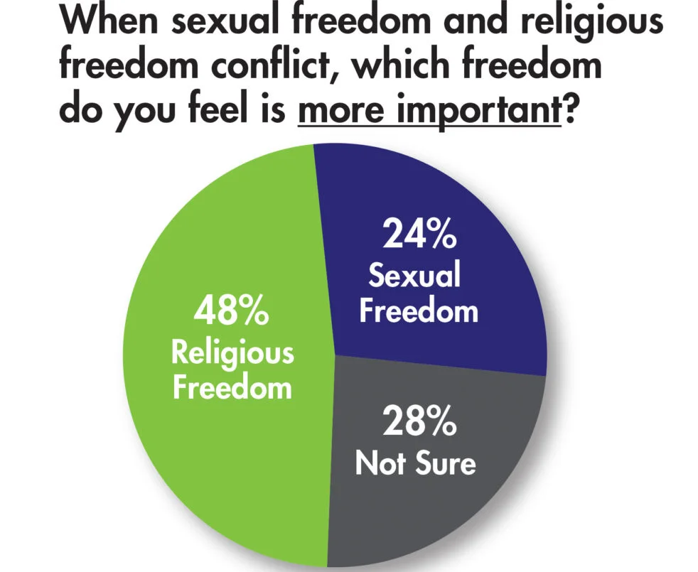 Almost half — 48 percent — say religious freedom is more important in such cases. Almost a quarter (24 percent) vote for sexual freedom and 28 percent aren’t sure, according to the study, released Tuesday (June 27).