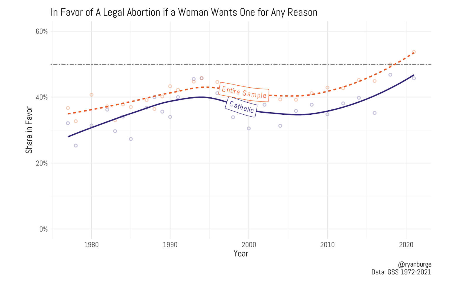 By 2021, fifty-three percent of Americans supported abortion on demand along with forty-five percent of Catholics. But, it’s worth noting that the contours of the two lines run in almost perfect unison. As the country moved left on abortion, so did the average Catholic.