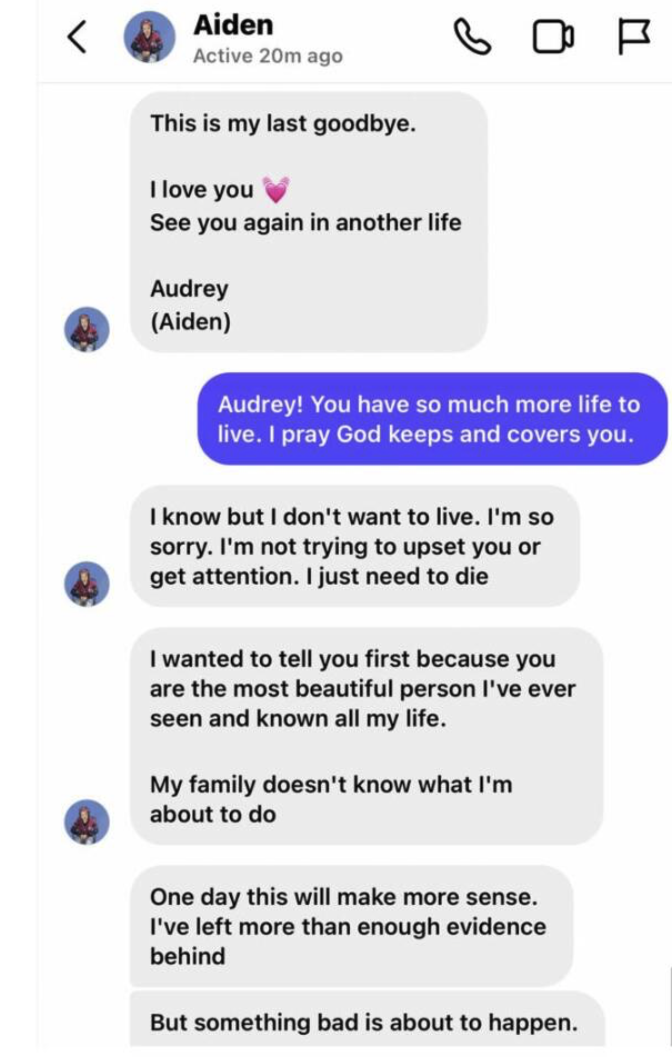 IMAGES: From screen shots of the final messages sent by Audrey/Aiden Hale on social media, which have appeared on many social media platforms and in “conservative” media reports.