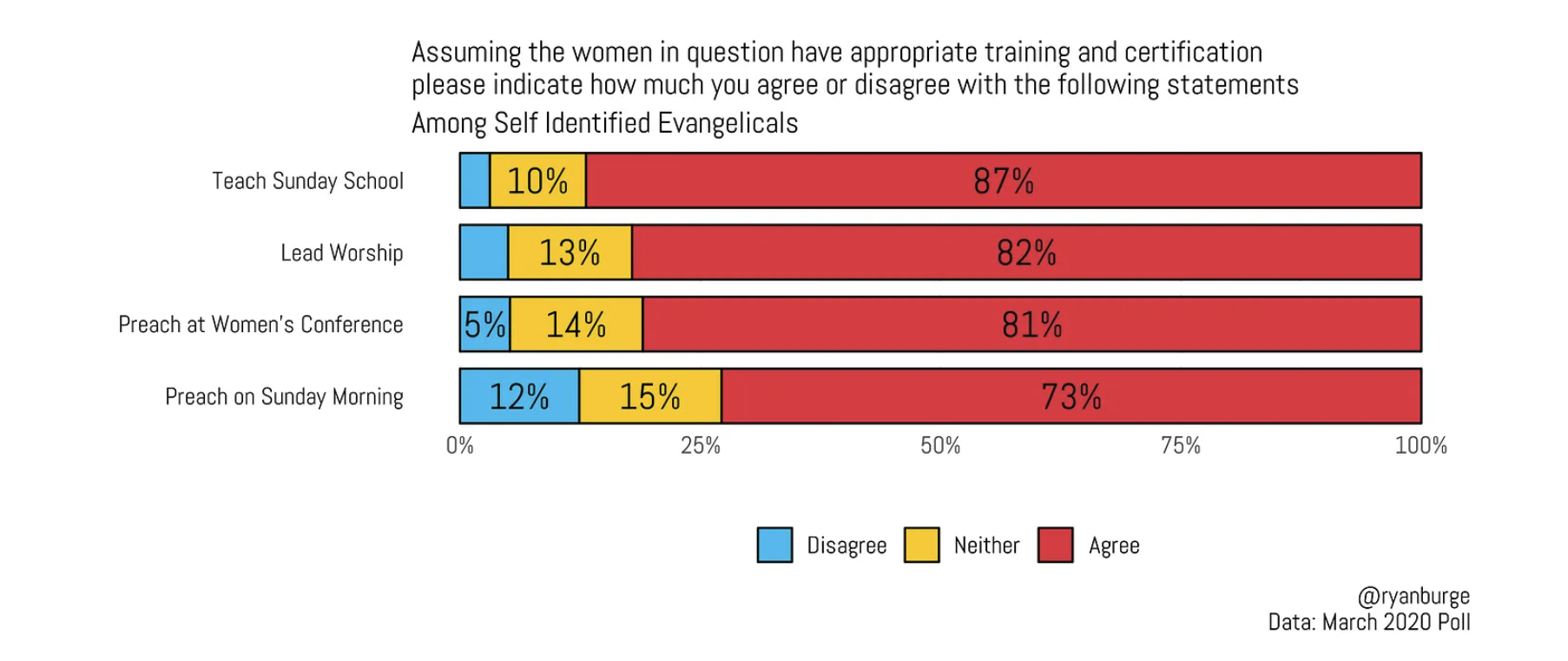 Yeah —-there’s overwhelming agreement among evangelicals that women can teach Sunday School, lead morning worship and preach at a women’s conference. Even in the case of women preaching from behind the pulpit on Sunday morning there is very little resistance.