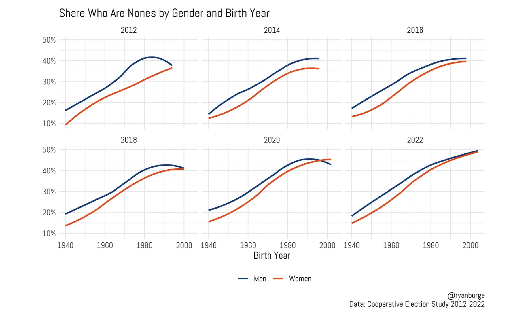 This is the share of women and men who identify as atheist, agnostic or nothing in particular based on birth year. I am showing you every election year in the CES because the sample size is particularly large during those collection periods.1