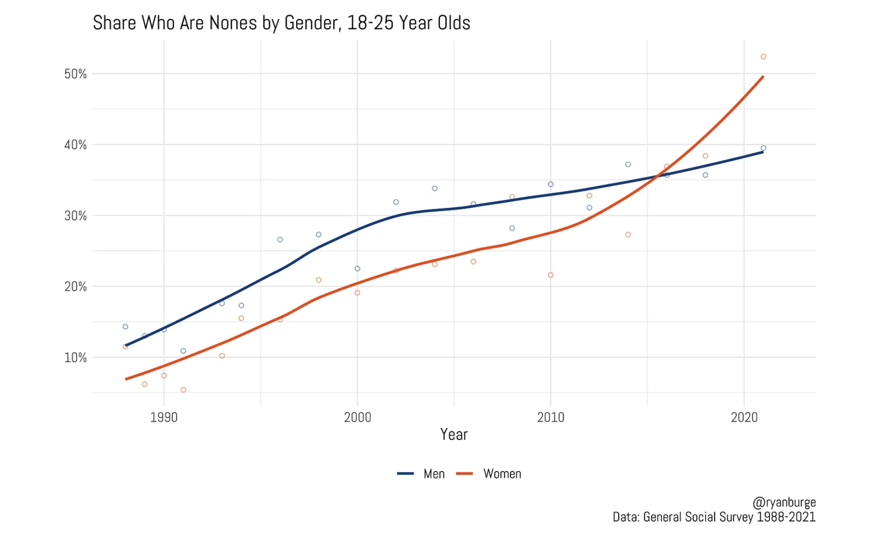 But then the line for women begins to shoot up, while the line for men only rises slightly. In the 2021 data, over half of young women are nones compared to just 40% of men. This may be just some oddity with the recent GSS data that I discuss in depth in this post:
