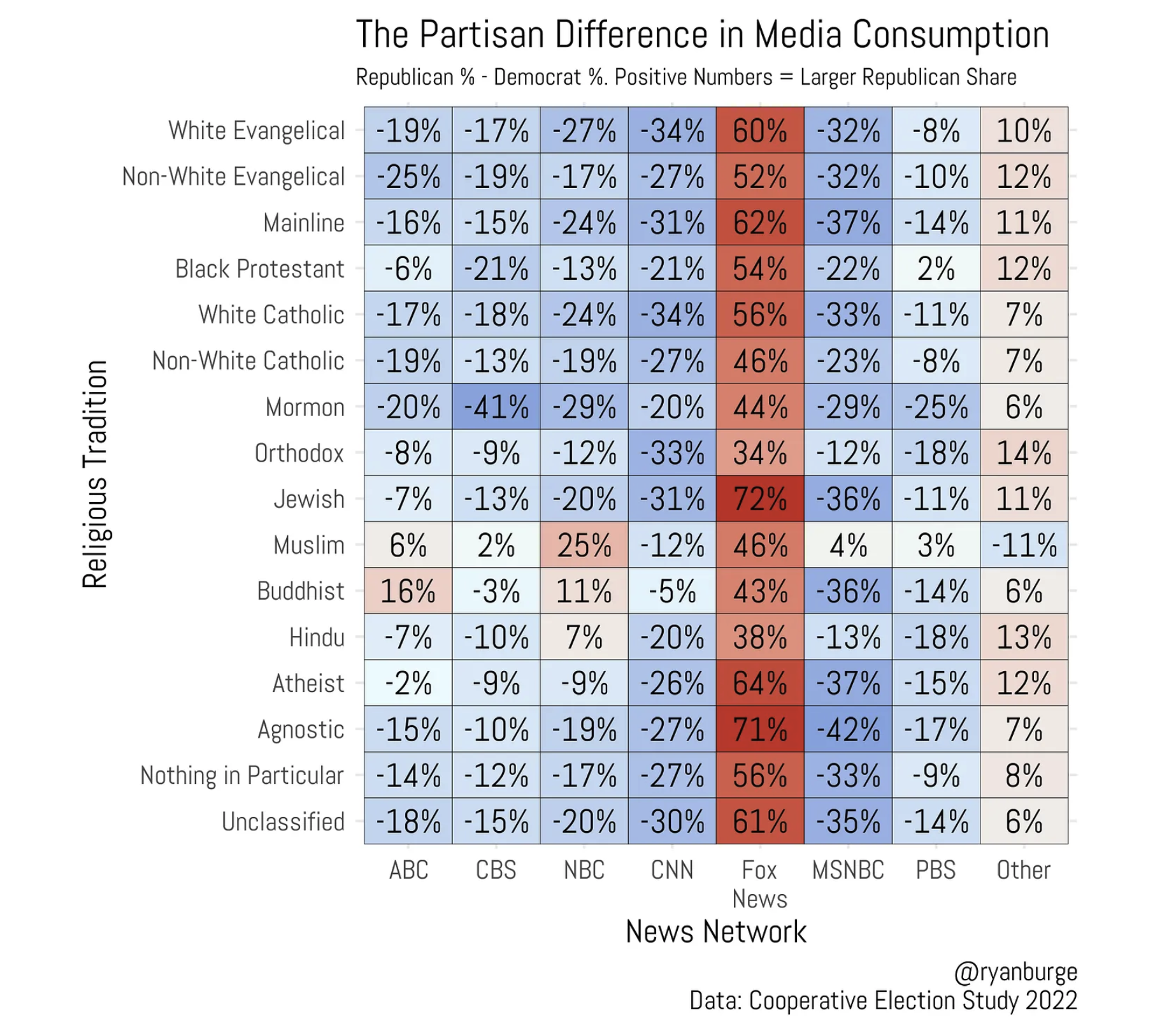 Holy cow, Fox News is such an outlier. It’s amazing to me how no other news network comes even close to the partisan lean of Fox viewers and that’s even when controlling for religious tradition. For instance, a White evangelical Republican is 60 points more likely to watch Fox News compared to a White evangelical Democrat. And that’s a pretty standard point spread, really. In very few cases is it less than 40 percentage points.